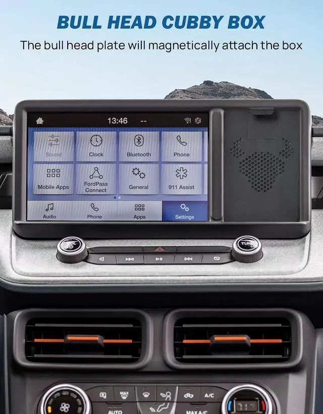FITMENT - The cubby phone mount storage box is compatible with 2022 2023 2024 Ford Maverick. 2 in 1 cubby mount allows an excellent phone holder location while providing a valuable space for small items such as coinsHOLD YOUR PHONE SECURELY - Insert the phone holder into the FITS slot of the cubby box you will get a cubby phone holder storage box. The phone mount is 360° rotatable fits for 3.7 -7 inch (screen diagonal distance) cell phone thick case case-friendlyBULL HEAD CUBBY BOX - If you don't need to hold your phone you can magnetically attach the bull head plate to the cubby box.