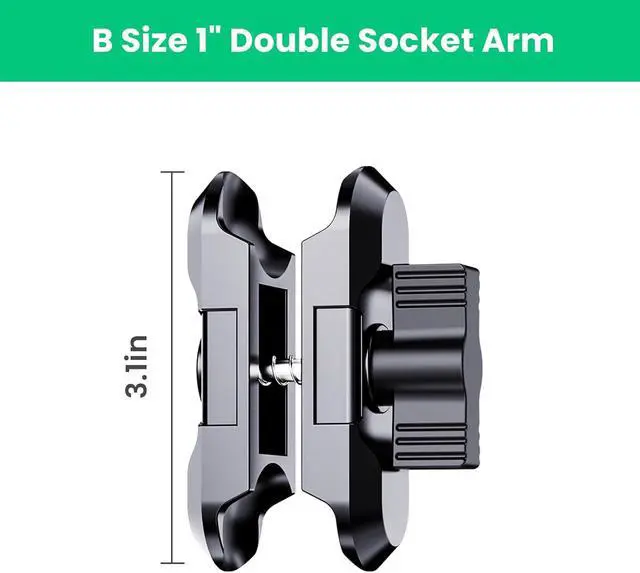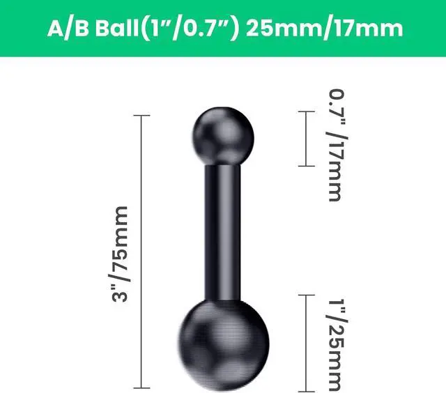 SIZE: Cradle fits for 4 to 7 inches A/B ball is 17mm and 25mm double socket arm is 76mm compatible with B ball (25mm) M8 bolt with 25 mm ballDIY