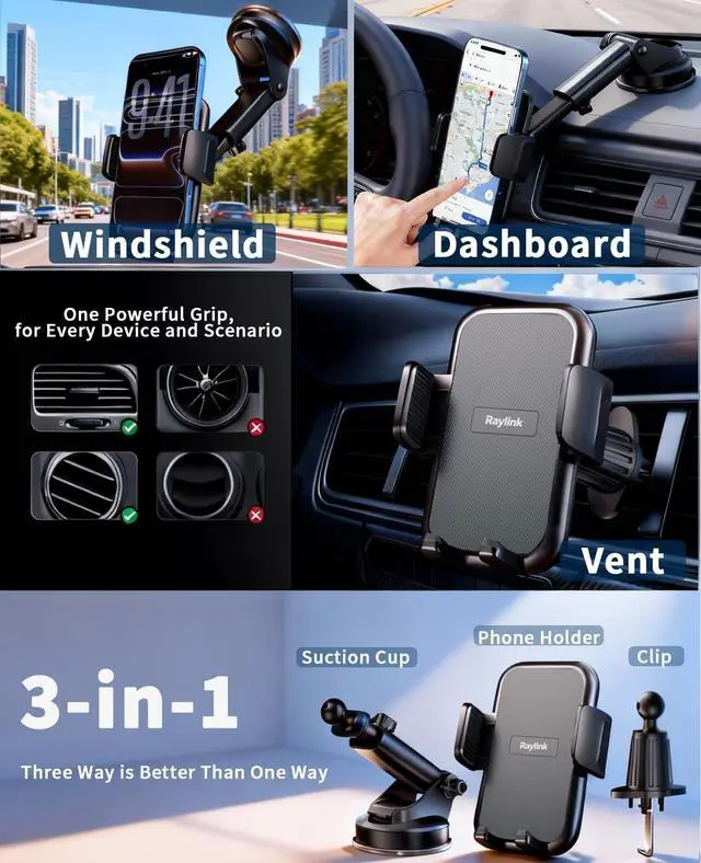 • RayLink2026 True Military-Grade Car Phone HolderUpgraded Strongest Suction & Clip Universal Cell Phone Mount Truck Stand for Dashboard Windshield Vent for iPhone 17 Pro Max 16 15