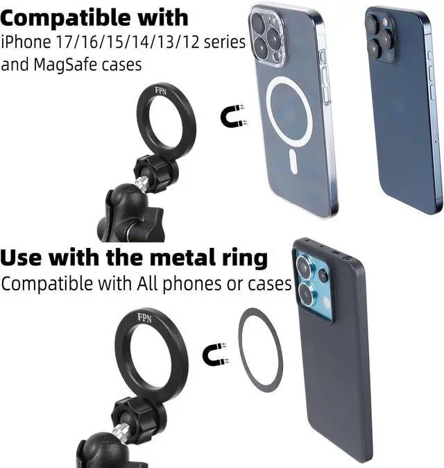 MagSafe & All Phones: Offers perfect compatibility for MagSafe iPhones including the iPhone 12/13/14/15/16/17 series for a secure snap-on connection. For use with non-magnetic phones or cases the included 2 metal rings provide a simple and effective universal mounting solution.