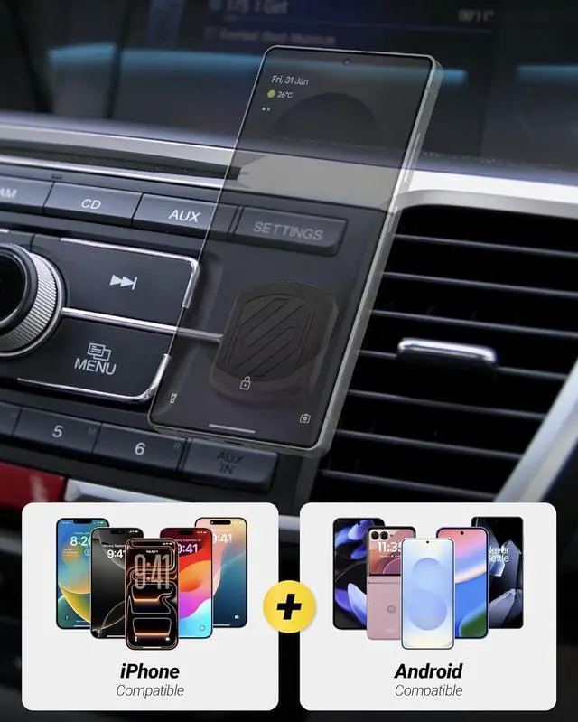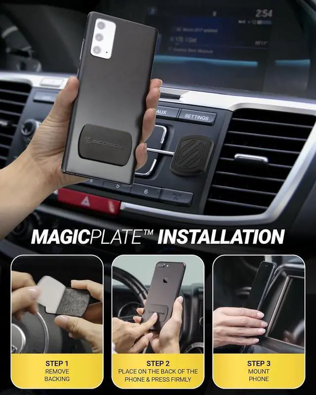 No Problem: The Scosche magnetic car mount has upgraded strong magnets that provide a secure hold for iPhone Galaxy and other Android devices. The HD MagicPlate must be applied directly to the phone or case exterior in order for the car cell phone holder to workFixed Head for