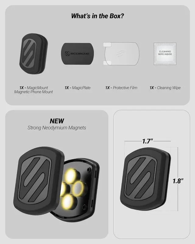 You Get: Includes the Scosche MagicMount Flush Surface Mount HD MagicPlate protective film cleaning wipe and installation guide. Backed by Scosches Lifetime Tech Support and Limited 3-Year Warranty