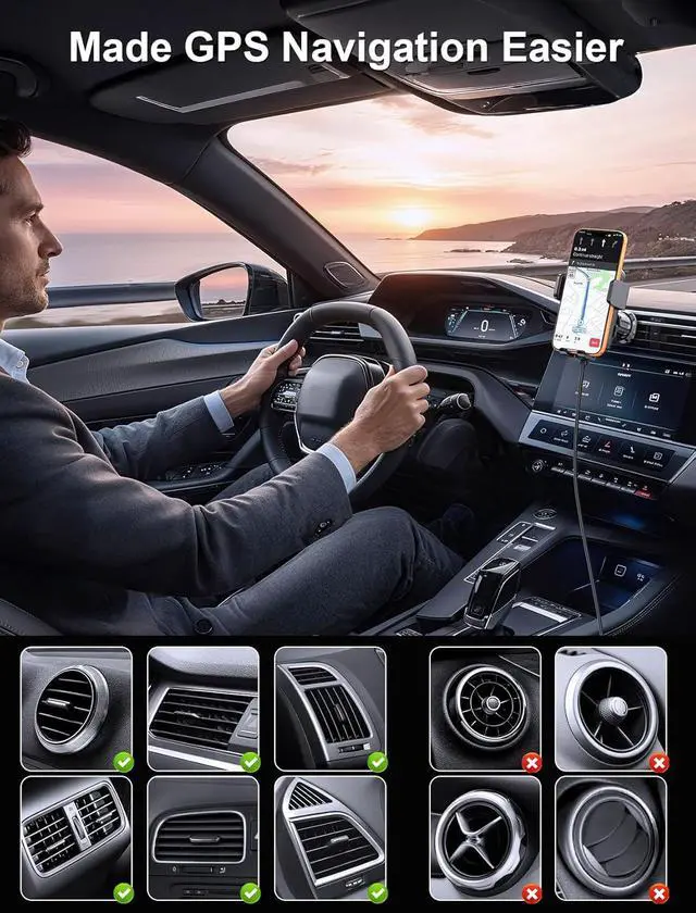 This cell phone holder car charger is applied to most cars pickup trucks SUVs taxis. A perfect assistant for Uber Lyft drivers. Make Drive EasierCombines the wireless charger & car phone mount offers fast charging and saves you from messing with cables while driving. A 360°rotating sphere can help you get the most comfortable and safest GPS Navigation and viewing angle without neck or eye strains while charging your phone. Secure and SableThis wireless car charger mount features a strong suction cup and non-slip silicone arms to keep your phone securely in place even when driving on bumpy roads will make driver safer and convenience with this car charger mount.