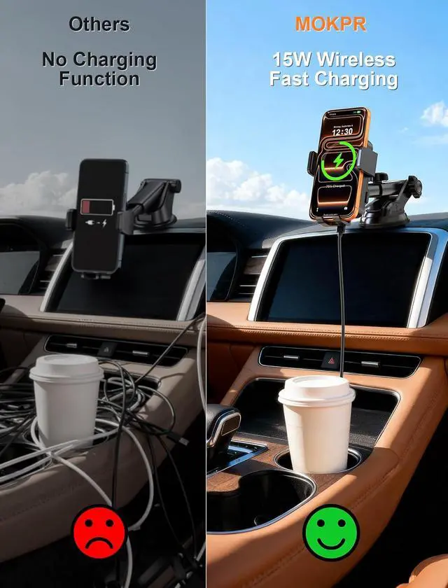 Auto-Precise Alignment ChargingMOKPR car phone holder charger can intelligently identify your device and charge safely just place your phone against the wireless car charger holder and it will automatically lock with the charging coil Aligned so you don't have to worry about your phone draining too quickly while navigating and always keep your phone fully charged. The upgraded smart chip has overheating protection overcharge protection short circuit protection and other functions to protect the health of your phone battery. Multiple Mounting OptionsThe phone holders for your car has multiple mounting methods to stick to windshield dashboard air vent or even the flattest surfaces and makes GPS navigation and calling easier than ever.