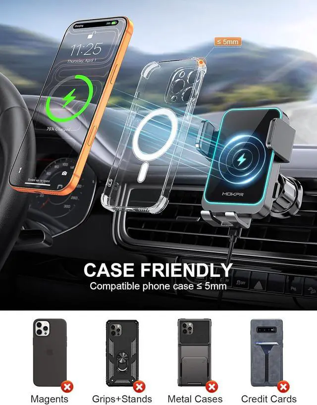 This phone mount for car has anti-slip rubber pads stable support shelf firm & scratch-free claw and manaully adjust the the arms can keep your phone more stable and ensure safer drivingFOD Function & Case FriendlyThe wireless charging technology and large coil maximize the charging output and efficiency making charging faster than standard car wireless charger. MOKPR car mount wireless charger supports charging through phone cases up to 4mm thick. FOD foreign body detection prevents abnormal charging of equipment please remove metal/magnetic objects credit cards or pop holders before charging. Wireless Car Charger15W Wireless Fast Charging for LG V50/V40/V30/G8/G7; 10W for Galaxy S24/ S23 Ultra/S23+/S23/S22 Ultra/S22/S21/S20/Note 20/Note 10+/Note 10; 7.5W for iPhone 16 15/14/14 plus/14 pro/14 pro max/13/13 Pro/12 Pro Max/12 Pro/12/11 /11 Pro /11 Pro Max /SE /XS /X/XR/8 Plus/8;