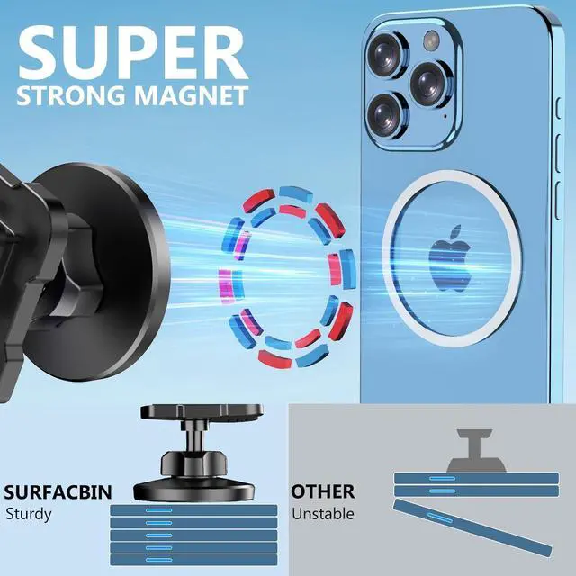 (Note: Not applicable to other vehicle models). 45° Left & Right Rotation The air vent phone holder rotates 45 degrees left & right so you can enjoy the best viewing angle while driving. You can easily adjust the angle to display your phone in portrait mode for easy navigation music and calls. Surfcabin magnetic vent phone holder is small and lightweight and will not block the air vents' airflow or restrict the vent shutters' movement. Magnetic EnhancementThe clamp of the Surfcabin magnetic mobile phone holder has stronger magnetic attraction. 20pcs N52 magnetic pins total. The magnetic attraction effect is stronger and compatible with iPhone mobile phone cases MagSafe cases or smooth phone case. Full Metal MaterialSurfcabin CNC 6061 Aluminum Alloy machined bracket is custom-fit to grab the vent. The vent bracket uses a customized laser-formed rubber pad which is exquisitely crafted durable scratch-resistant and non-slip. Easy to installThe vent phone holder for installation is easy in 1 minutes with no drilling or cutting required. The installation position fits well. Will not interfere with visibility out of the windscreen. Will not damage the original accessories.
