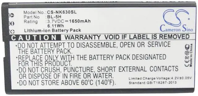 Battery Part Numbers BL-5H Capacity: 3.7V 1650mAh / 6.11W h