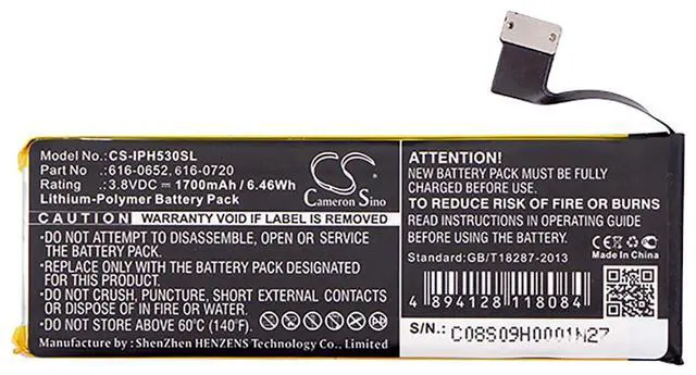 Battery for Apple A1234 A1457 A1516 A1518 A1528 A1529 A1530 A1533 iPhone 5s Compatible with the following devices A1234, A1457, A1516, A1518, A1528, A1529, A1530, A1533, iPhone 5s, ME341LL/A, ME342LL/A, ME344LL/A, ME345LL/A, ME347LL/A, ME348LL/A, ME349LL/A, ME432LP/A Compatible with Battery Part Numbers 616-0652, 616-0719, 616-0720, 616-0722, 616-0728