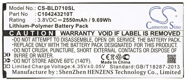 Battery for BLU D710 D710X N030 N030L Neo 5.5 Studio 5.5 K C104243210T Mobile Compatible with the following devices D710, D710X, N030, N030L, Neo 5.5, Studio 5.5 K Compatible with Battery Part Numbers C104243210TNot Accept OEM Capacity: 3.8V 2550mAh / 9.69W h