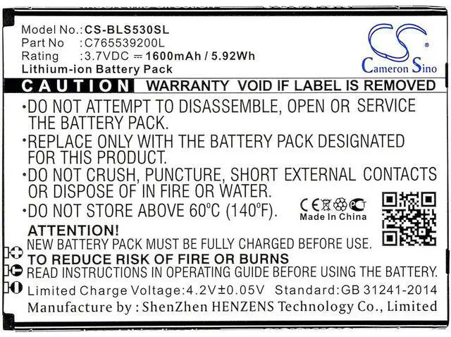 Battery Part Numbers C765539200L Capacity: 3.7V 1600mAh / 5.92W h