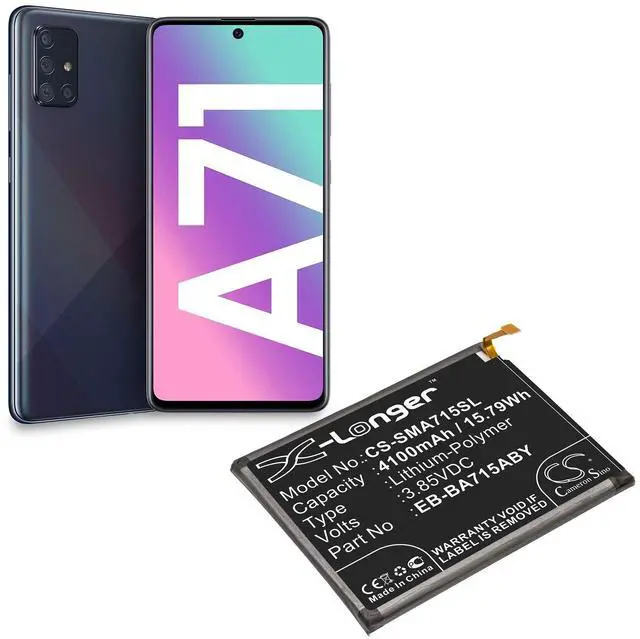 Battery for Samsung Galaxy A71 SM-A715F SM-A7160 SM-A716B SM-A716G SM-A716U Compatible with the following devices Galaxy A71, SM-A715F, SM-A7160, SM-A716B, SM-A716G, SM-A716U Compatible with Battery Part Numbers EB-BA715ABY, GH82-22153A
