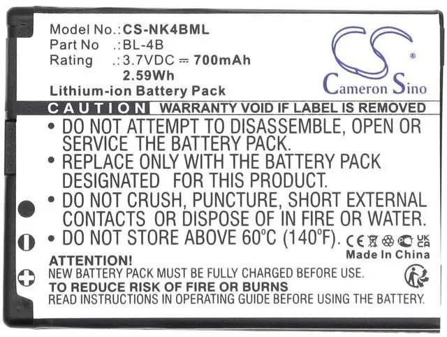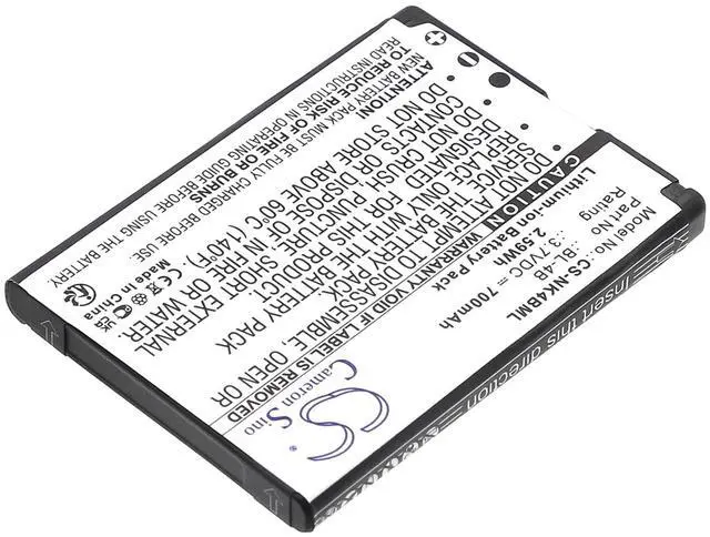 Battery for Nokia 1606 2505 2630 2660 2760 3606 5000 6111 7070 Prism 7088 7360 Compatible with the following devices 1606, 2505, 2630, 2660, 2760, 3606, 5000, 6111, 7070 Prism, 7088, 7360, 7370, 7373, 7500, 7500 Prism, N76 Compatible with Battery Part Numbers BL-4B, BL-4BA 2025.07 Capacity changed from 750mAh to 700mAh