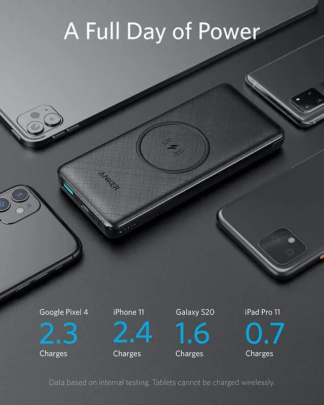 PowerCore is equipped with a 10,000mAh capacity to keep your devices charged for at least a full day. Charge an iPhone 11 or Pixel 4 more than twice, or charge a Galaxy S20 over 1.5 times.