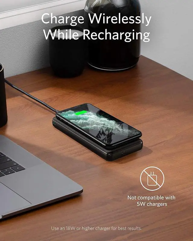 Do not use a 5W charger to charge your phone wirelessly and recharge PowerCore simultaneously. To charge simultaneously at full speed, it's recommended to use a charger with at least an 18W output.
