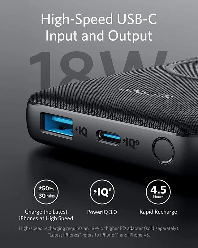 The 18W USB-C port is equipped with our exclusive PowerIQ 3.0 technology to offer high-speed charging to a wide range of mobile devices. Compatible with Power Delivery and Quick Charge technology.