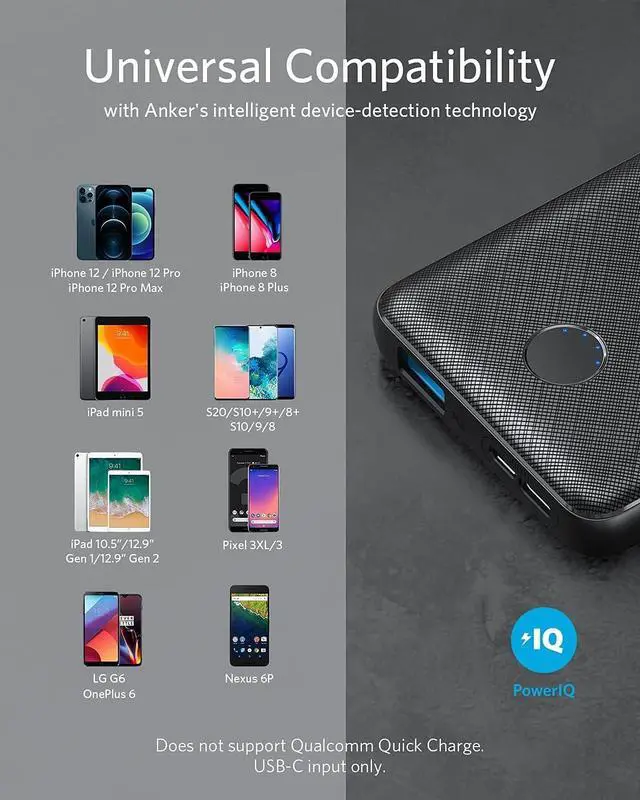 - Compatible with 12'' 2015 MacBook (USB-C cable required), iPhone XS / XS Max / XR, Android smartphones and tablets (including the Nexus 7), and other USB-charged devices.