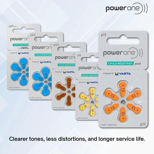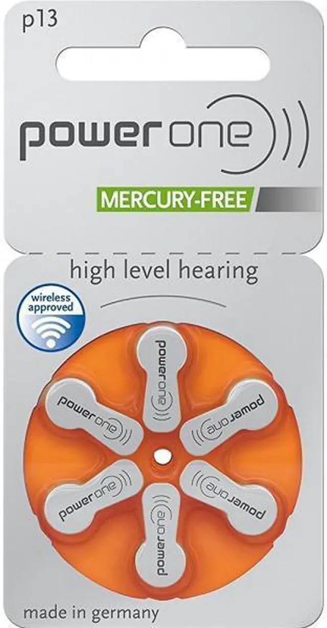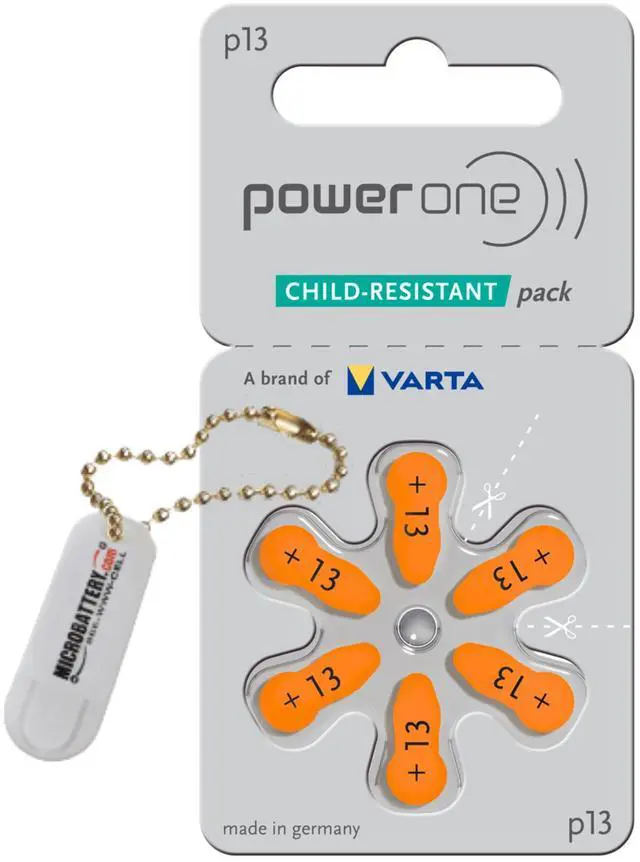 60 PowerOne Hearing Aid Batteries, Size 13, Comfort Pack, Zinc Air Hearing Aid Batteries. (60 batteries Standard dial pack, 10 cards of 6 cells each). VARTA Microbattery with its brand Power One has over 100 years of experience in developing innovative battery technologies. Featuring with its consumer-focused extra long tabs, Power One batteries are manufactured at the world s most up-to-date and biggest production site for hearing aid batteries in Ellwangen/Germany-well recognized for manufacturing quality and detailed precision. Subject to Germany s stringent safety guidelines and quality checks, every cell is tested for its electrical and mechanical characteristics in compliance with its specification. Cross reference size PowerOne P13, Rayovac 13AE, ZeniPower A13. Receive a handy 2 Cell Battery Holder Key chain, FREE with each order. (One Per Order)