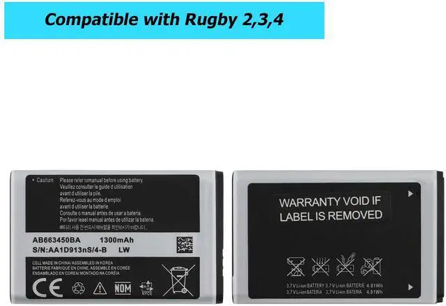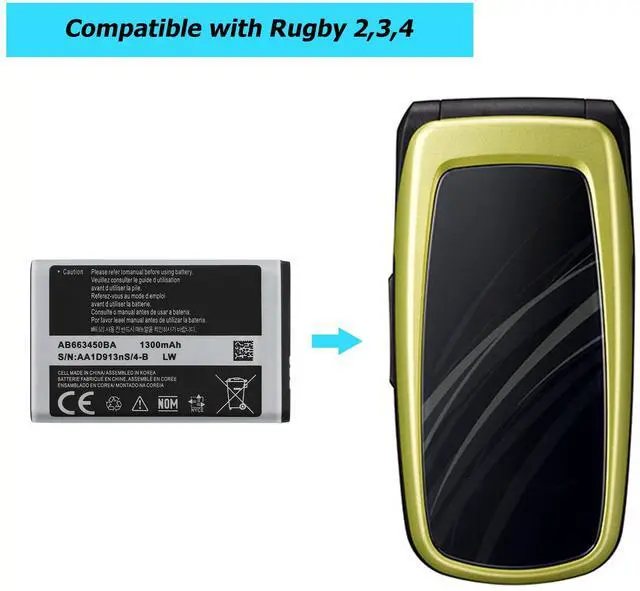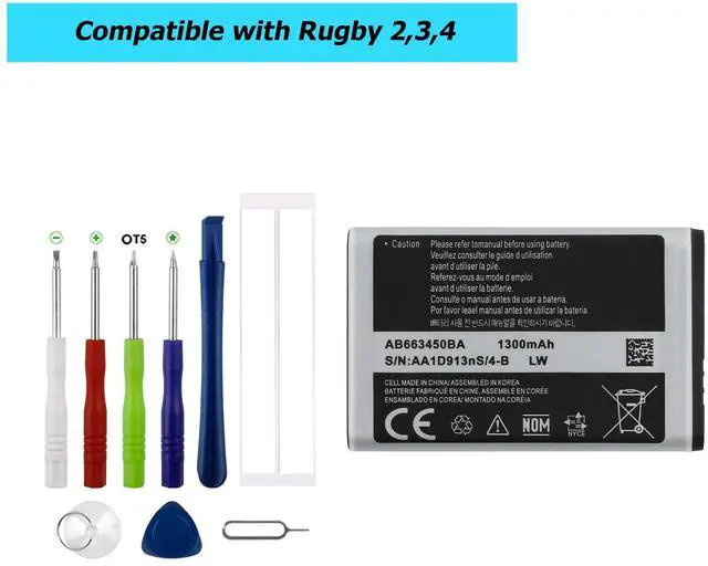 The Hoegoa New AB663450BA Replacement Battery is specifically designed for Samsung Rugby 2, 3, and 4 models, offering a reliable power solution for your device. Featuring a voltage of 3.8V, this premium-quality battery utilizes Class A cells and is certified with UL, CE, and RoHS standards to ensure safety and performance. Each unit undergoes rigorous quality control and delivers up to 526+ charge cycles, supporting fast and efficient charging for prolonged device usage. The package includes a comprehensive technical toolkit for secure installation. Please note that no installation guide is provided; professional assistance is recommended if you are unfamiliar with battery replacement. Ensure compatibility with your device before purchase for optimal results.