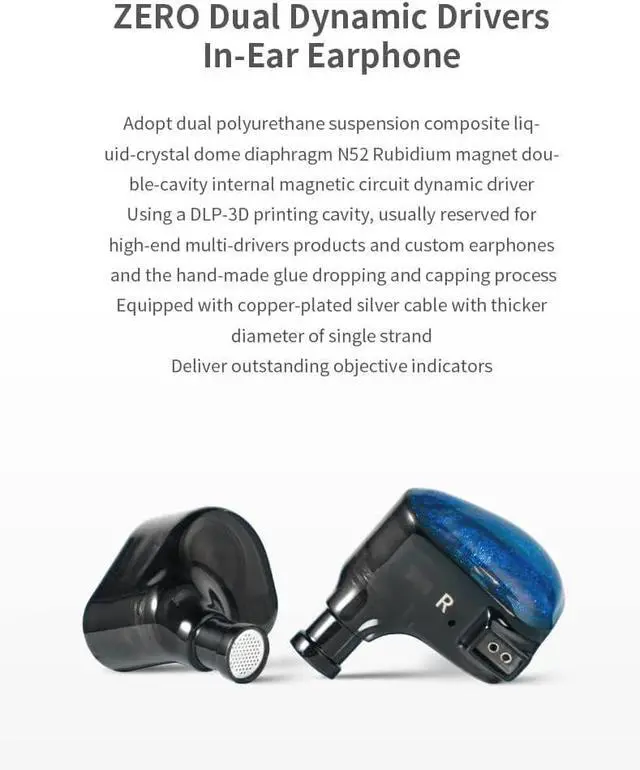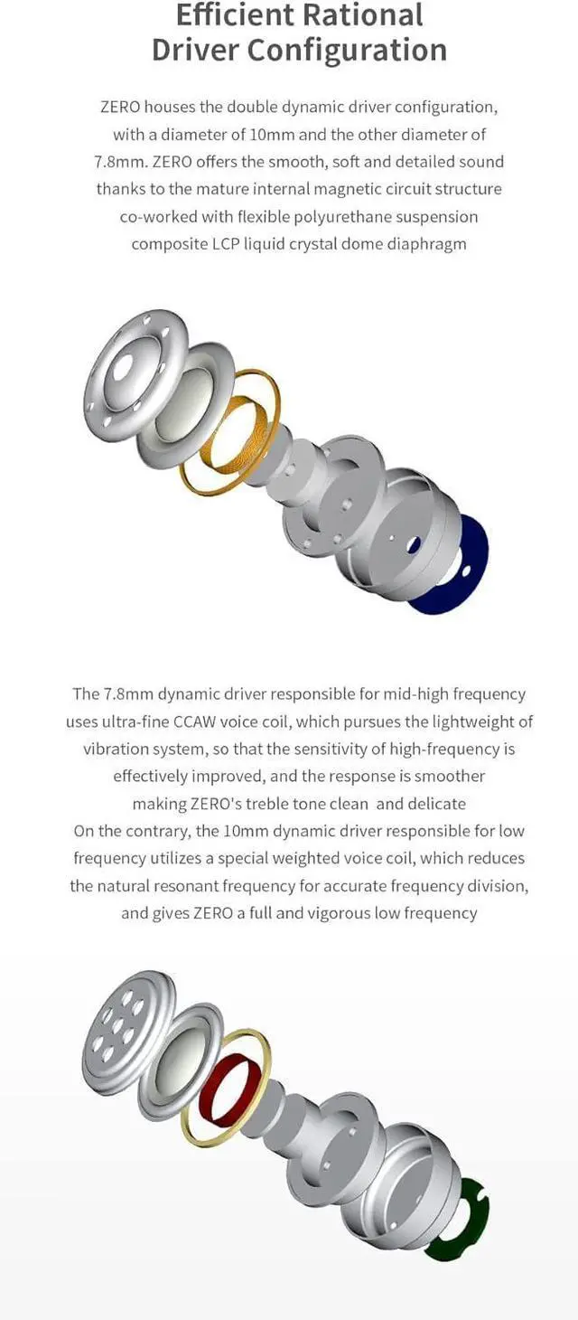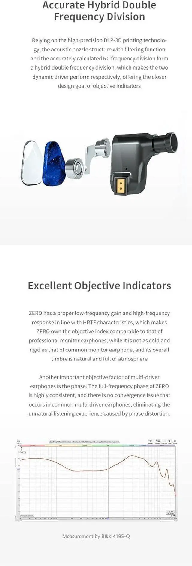 Objective Indicators: ZERO has a proper low-frequency gain and high-frequency response in line with HRTF characteristics which makes ZERO own the objective index comparable to that of professional monitor earphones while it is not as cold and rigid as that of common monitor earphone and its overall timbre is natural and full of atmosphereExcellent objective indicators: Zero has a suitable low frequency gain and a high frequency response in line with HRTF characteristics making ZERO owner of the lens index comparable to that of professional monitor headphones while it is not as cold and rigid as that of ordinary headphones and its overall timbre is natural and full of atmosphere