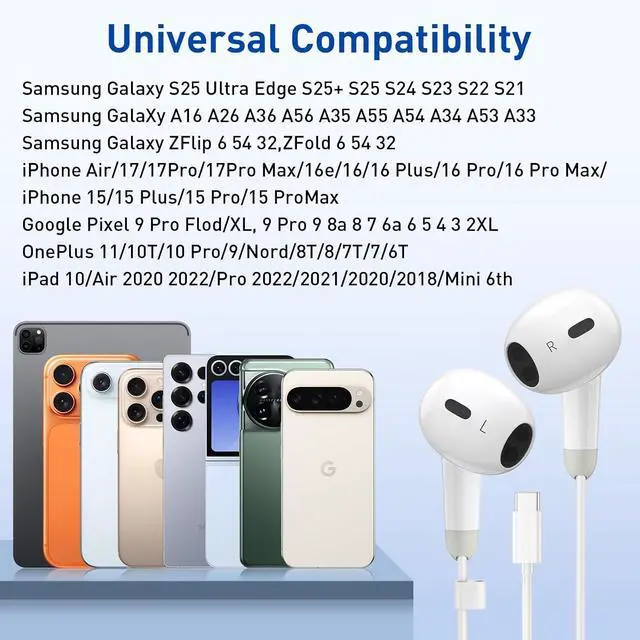 Wide Compatibility2-Pack USB-C Headphones for iPhone 17/17 Pro/17 Pro Max/16/16 Plus/16 Pro/16 Pro Max/15/15 Plus/15 Pro/15 Pro Max iPad Pro 12.9 /11-inch iPad Air 4/5 iPad Mini 6 MacBook/MacBook Pro Galaxy S25/S25+/S25 Ultra/S24/S24+/S24 Ultra/S23/S22/S21/S20 Pixel 9/9 Pro/9 Pro XL/8/8a/8 Pro/7/7a/7 Pro/6/5/4/3/2 XL and More USB-C Devices. One-Button Smart Control & Built-in Mic Stay connected and in control with the multifunctional inline remote. Answer/end calls reject incoming calls play/pause music and adjust volumeall without touching your phone. The high-sensitivity built-in microphone delivers clear hands-free calls for driving working video conferencing or gaming. No need to fumble with your device when you're on the go.