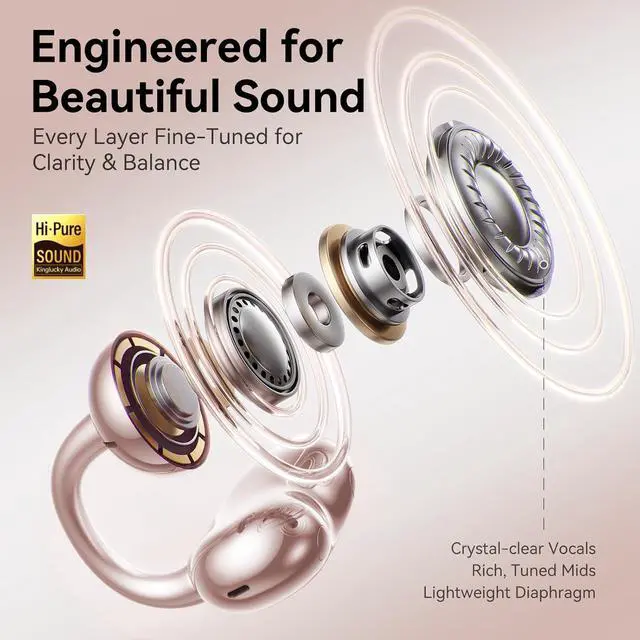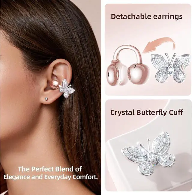 Gentle on Your Ears Clear in Every Detail. Because these earbuds dont seal inside your ears the sound feels open and natural instead of overwhelming. Tuned for clear vocals and smooth balance they let you enjoy podcasts calls or playlists without the pressure and fatigue of in-ear headphones. Everyday-Ready with Bluetooth 6.0 & IP56 Protection. Fast pairing and stable Bluetooth 6.0 keep you connected instantly. With IP56 sweat and rain resistance these wireless clip-on open-ear earbuds are ready for real life from commuting and office calls to outdoor walks and light workouts. Gift-Ready Earbuds with Detachable Crystal Earrings.