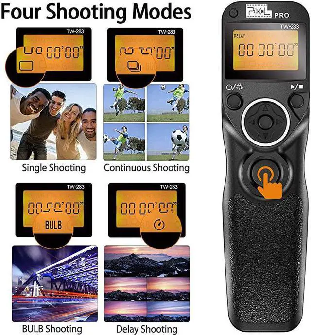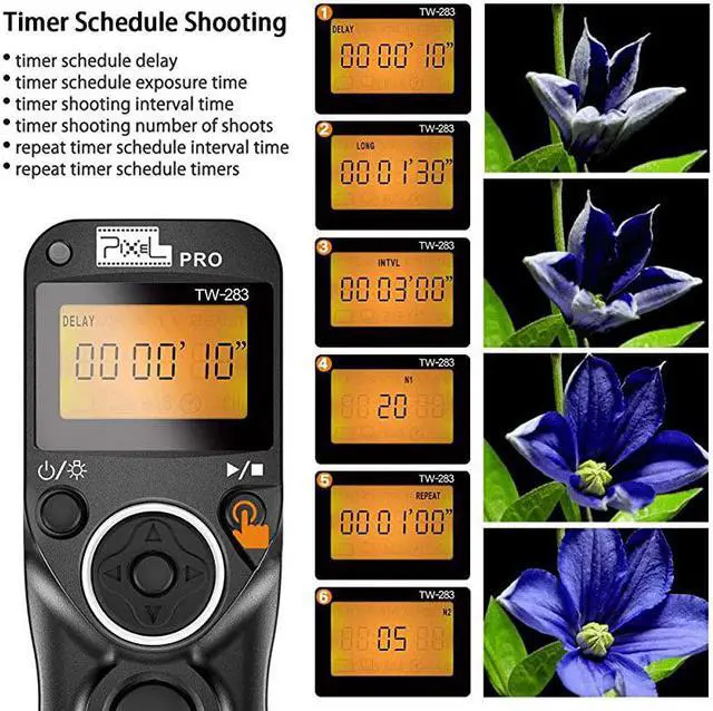 Size: TW-283E3 for Canon4 TYPES SHUTTER FUNCTION TW-283 supports simple single shooting, 1S continuous shooting, [ BULB ] shooting, delay shooting and timer schedule shooting. 6 KINDS OF TIMER FUNCTION Delay Shooting Setting can set delay time and shooting number, the delay time alters from 1s to 59s, shooting number alters from 1 to 99. timer Shutter Release shooting time can be set from 0 sec to 99hrs59mins59sec. Shooting number can be set from 1 to