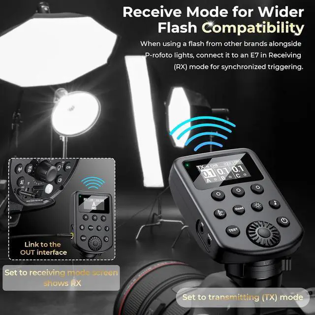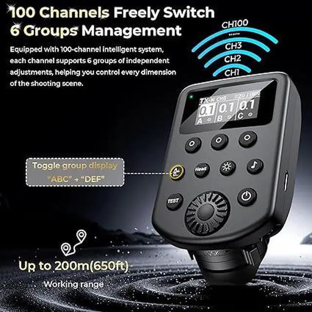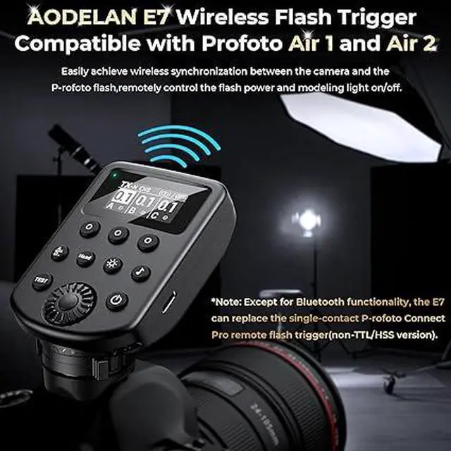 AODELAN E7 Wireless Flash Trigger is an all-in-one transmitter and receiver unit. Equipped with an intelligent channel and group system.100 independent channels,with 6 groups of lights in each channel that can be independently adjusted, precise deployment of lighting effects,fearless in the face of complex shooting scenes.Easily achieve wireless synchronization between the camera and the for Profoto flash,remotely control the flash power and modeling light on/off.The maximum working range can reach 200 meters (650 feet).