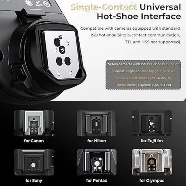 Compatible Cameras:Compatible with Single-Contact Universal Hot-Shoe Interface,for Canon, for Sony, for Nikon, for Fujifilm, for Pentax, and for Olympus Cameras.Compatible with cameras equipped with standard ISO hot-shoe(Single-contact communication, TTL and HSS not supported).