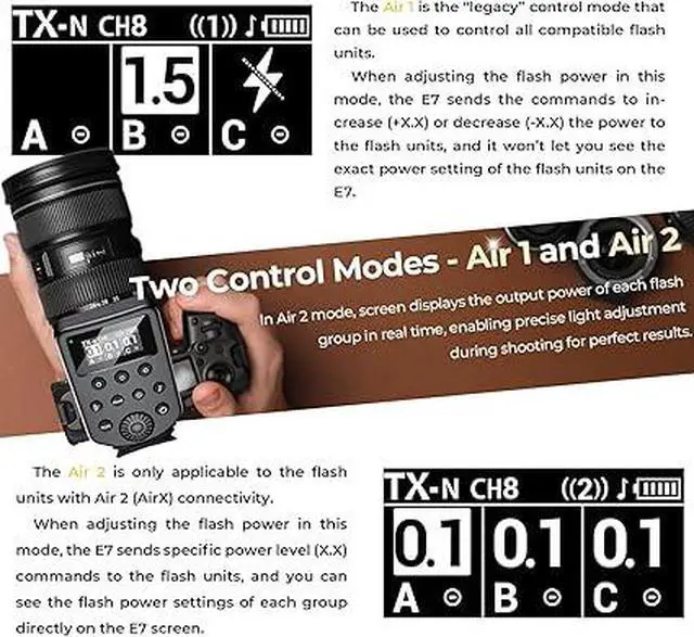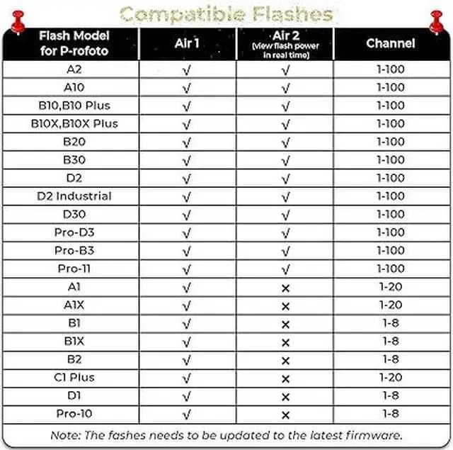 Compatible Flashes: This Wireless Flash Trigger is supports Air 1 and Air 2 (100 channels available, with real-time flash power viewing on E7's display): Compatible with Profoto A2, A10, B10, B10 Plus, B10X, B10X Plus, B20, B30, D2, D2 Industial, D30, Pro-D3, Pro-B3, Pro-11. Supports only Air 1 (available on channels 1-8 or 1-20 only): Compatible with Profoto A1X, B1, B1X, B2, C1 Plus, D1, Pro-10.
