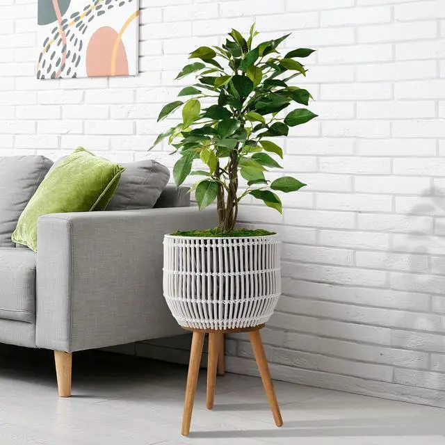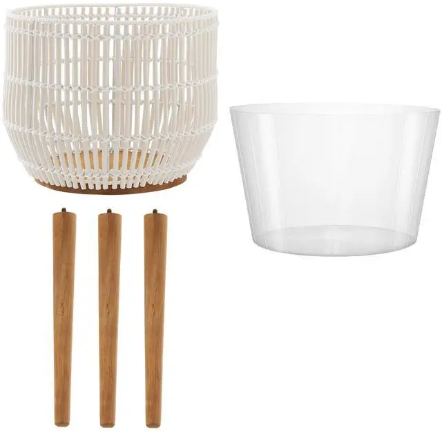 Designed with both style and function in mind. This indoor floor planter includes a removable plastic liner to help contain water and soil, keeping your home cleaner and your plants healthier. Three acacia wood legs keep the stand steady and secure, while its lightweight design makes it easy to reposition throughout your home. This planter is a thoughtful solution for plant lovers seeking both form and function. Its natural textures and warm tones bring a relaxed, organic feel to your indoor environment.