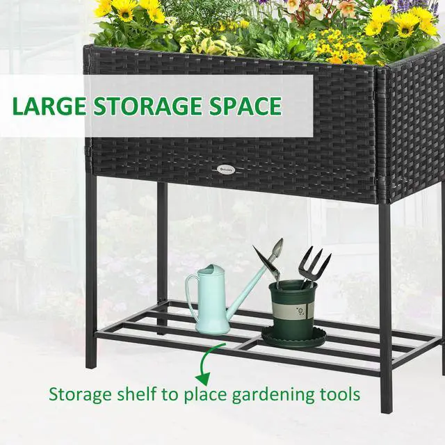• Raised Garden Bed, Elevated Planter Box with Rattan Wicker Look, Tool Storage Shelf, Portable Design for Herbs, Vegetables, Flowers, Black