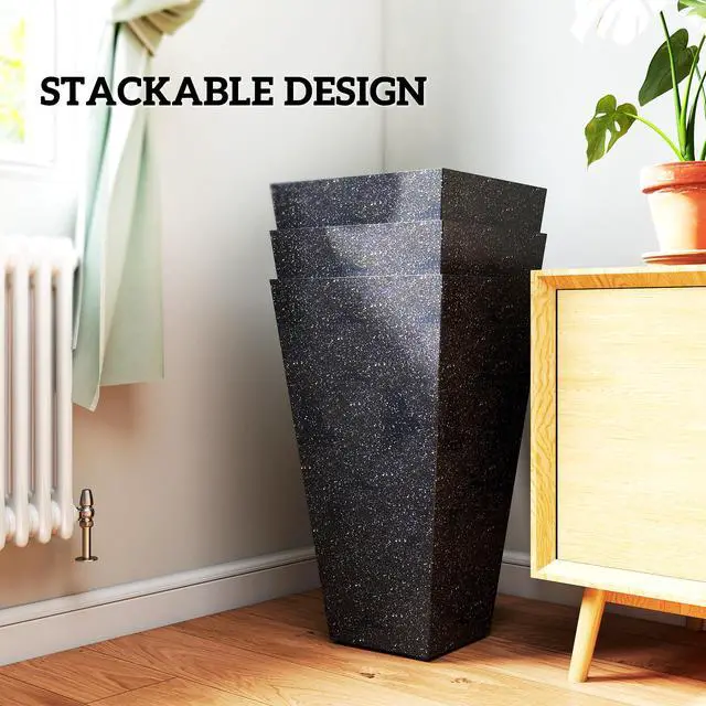 • 28" Tall Planters, Set of 3 Plastic Flower Pots with Marble Finish and Drainage Holes, Stackable Tapered Outdoor Planters, Black