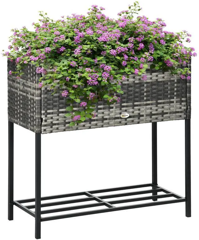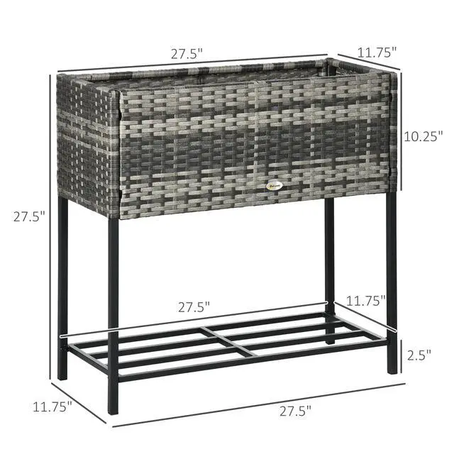 • Raised Garden Bed, Elevated Planter Box with Rattan Wicker Look, Tool Storage Shelf, Portable Design for Herbs, Vegetables, Flowers, Gray