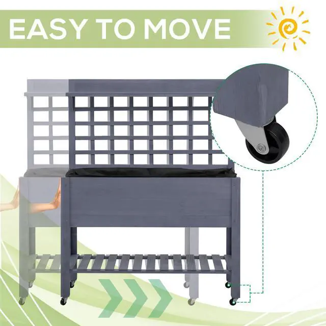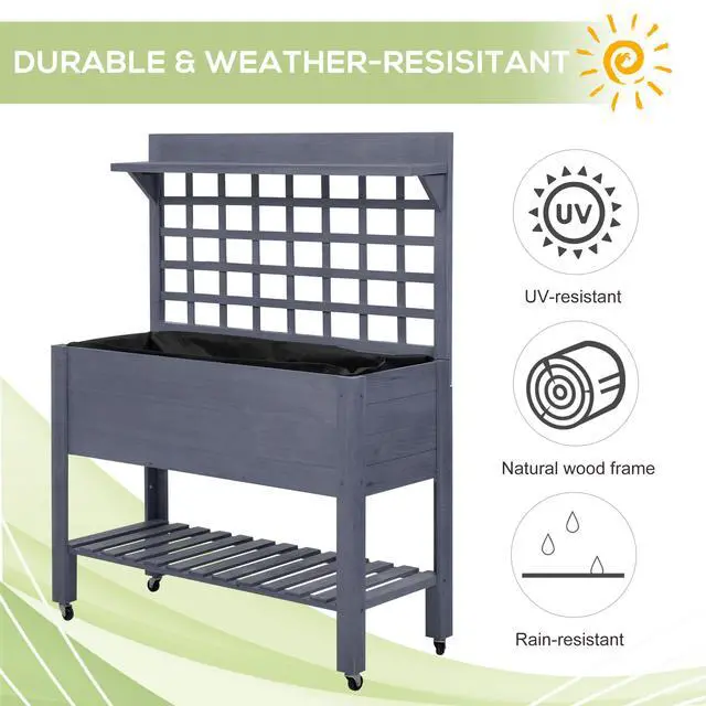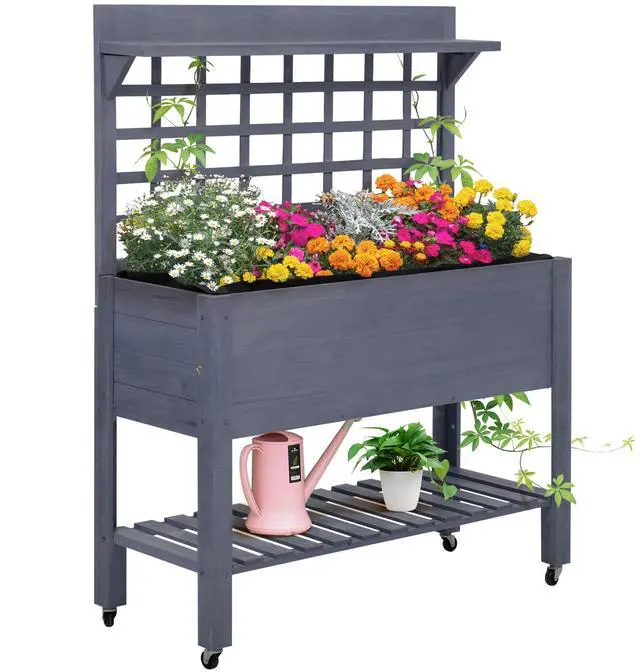 • 41" Raised Garden Bed with Trellis on Wheels, Wooden Elevated Planter Box with Legs and Bed Liner, for Flowers, Herbs & Vegetables, Gray