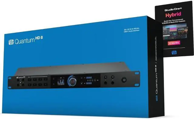 PreSonus Quantum HD 8 is a 26x30 USB-C desktop audio interface, ideal for producers, musicians, and creators looking for high-fidelity audio and flexible connectivity options for the studio or live onstage. The HD 8 features eight high-definition MAX-HD mic preamps with +75 dB of gain, ideally suited for today's most popular microphones. Guitarists and bassists will love the front-facing instrument inputs, which were codeveloped with Fender engineers. High-performance 32-bit / 192 kHz converters with 124 dB dynamic range let you hear and capture audio with stunning clarity. Use the Quantum HD 8 to record to a Mac/Windows computer or on your iOS/Android phone or tablet.