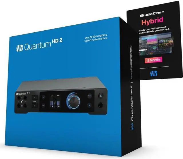 PreSonus Quantum HD 2 is a 20x24 USB-C desktop audio interface ideal for producers, musicians, and creators looking for high-fidelity audio and flexible connectivity options for the studio or live onstage. The HD 2 features two high-definition MAX-HD mic preamps with +75 dB of gain, ideally suited for today's most popular microphones. Guitarists and bassists will love the front-facing instrument inputs, which were codeveloped with Fender engineers. High-performance 32-bit / 192 kHz converters with 124 dB dynamic range let you hear and capture audio with stunning clarity. Use the Quantum HD 2 to record to a Mac/Windows computer or on your iOS/Android phone or tablet.