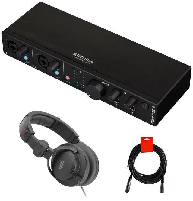 Turn your creative ideas into content for the world to hear with the black Arturia MiniFuse 4 Kit, a portable 4x4 USB Type-C audio/MIDI interface that combines great sound with operational simplicity and a robust software bundle. With its two low-noise mic/line/instrument preamps, the MiniFuse 4 helps singer-songwriters, musicians, sound designers, podcasters, and online creators get clean, quality recordings. Despite the MiniFuse 4's compact size, it provides plenty of connectivity. In addition to dual XLR-1/4" combo inputs, there are two 1/4" line inputs and four 1/4" line outputs, as well as a pair of headphone outputs with individual volume controls. The interface also includes traditional 5-pin MIDI sockets for integrating MIDI gear and a built-in USB 2.0 Type-A hub that's perfect for hooking up a keyboard controller. The bundled software titles Ableton Live Lite, Analog Lab Intro, Native Instruments GUITAR RIG 6 LE, Arturia FX, and more deliver loads of interesting sounds and cool effects, plus a highly capable and popular music production DAW. Paired with a HPC-A30-MK2 Closed-Back Studio Monitor Headphones from Polsen offer a solution for experiencing rich and natural sound when listening to music through a mobile device or monitoring a podcast on your computer. Plus 20 inch XLR-XLR Cable.