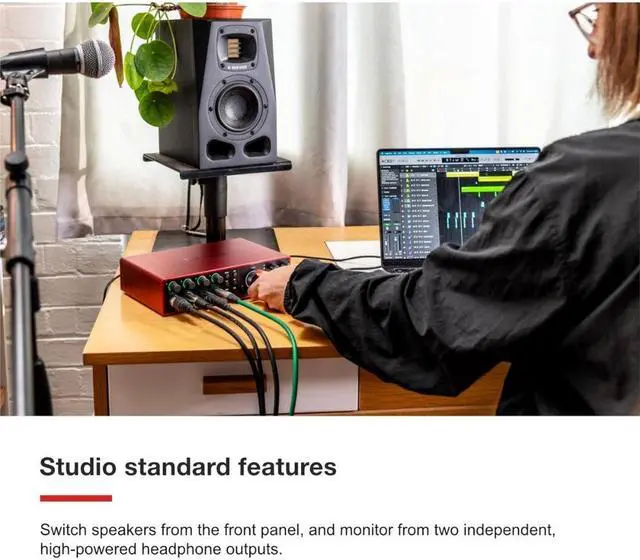 Scarlett 18i16 is the perfect hub to integrate your DAW and hardware with eight analog inputs, four analog outputs, plus ADAT and S/PDIF digital I/O, and MIDI I/O to connect external instruments, processors, and effects, and manage complex routing with incredible ease via Focusrite Control 2 software. The interface comes with production software including Pro Tools Artist, Ableton Live Lite, and a suite of instruments, processors, and effects.