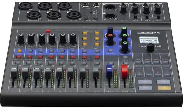 The Zoom LiveTrak L-8 digital mixer and recorder puts the flexibility of Zooms popular LiveTrak L-Series range in a compact and portable format thats optimized for podcasting and music production on the go. The LiveTrak L-8 provides tactile controls and intuitive functionality, so you can start a podcasting or music recording session in minutes.