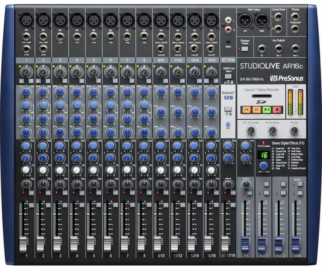 The StudioLive AR16c offers recording with or without a computer. Multitrack record and fly in backing tracks with its 24-bit / 96 kHz, USB-C audio interface or record and playback a stereo mix with the integrated SD digital recorder. Additionally, the mixer features a Super Channel, which allows you to connect four stereo analog and digital sources at once, enabling the mixer to be used with high-tech devices including smartphones and tablets for wireless Bluetooth streaming. The StudioLive AR16c ships with a power cord, USB-C cable, a rackmount kit, Studio One 3 Artist production software, and Capture recording software.
