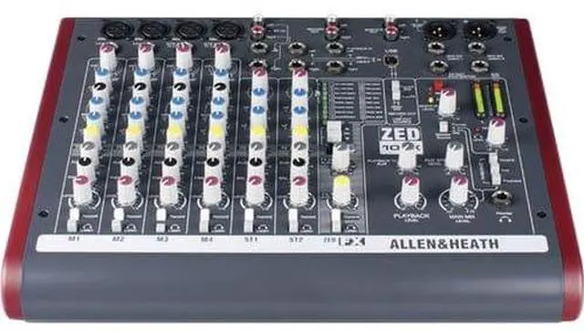 The Allen & Heath ZED-10FX Multi-Purpose Miniature Mixer is a compact yet versatile audio mixer for home recording, small sound reinforcement, video editing and small broadcast / podcast applications. The mixer features 4 XLR microphone inputs, 2 stereo line inputs and 4 Class A FET line inputs capable of accepting instrument and line level audio signals. Class A FET (Field Effect Transistor) inputs deliver the warmth associated with valve tube preamplifiers and a 26dB gain boost switch provides gain needed for instruments with very low output pickups.