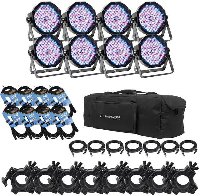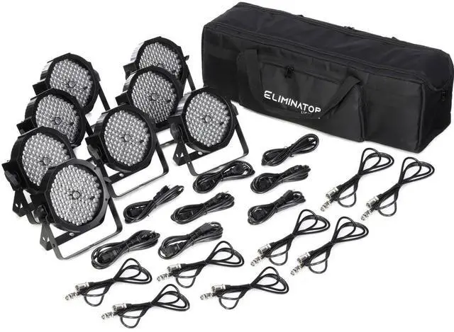 Check out the Eliminator Lighting MEGA FLAT PAK8 EP Kit which combines eight Mega Par Profile EP LED fixtures with seven 6.6 DMX cables and a soft carrying bag, to provide the primary components of a mobile lighting rig with protection from the rigors of on-the-road wear and tear. The Mega Par fixture is a compact, low-profile par designed for uplighting and stage lighting. This 2-in-1 fixture offers RGB color mixing plus UV black light, making it a multiuse wash fixture. And with 32 built-in light shows and 64 color macros, the Mega Par Profile EP is an ideal solution for multiple venues.