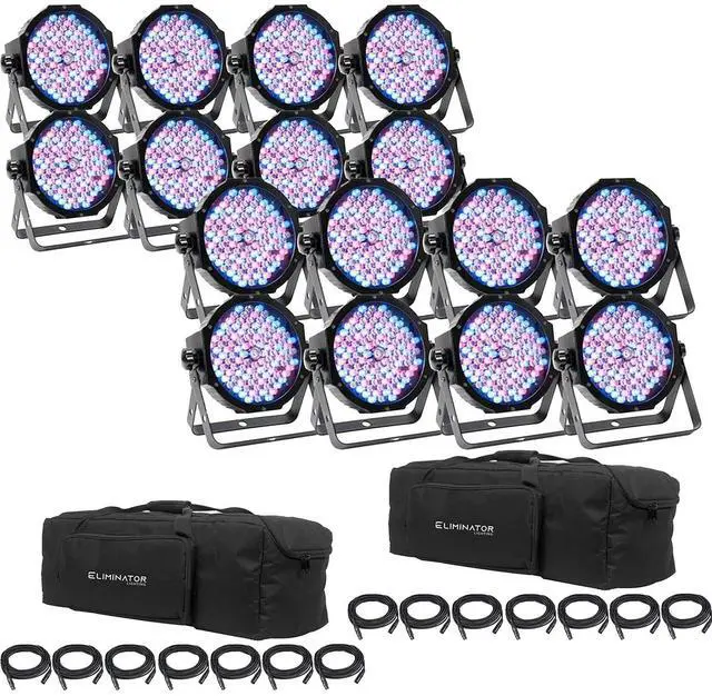 Check out the Eliminator Lighting MEGA FLAT PAK8 EP Kit which combines eight Mega Par Profile EP LED fixtures with seven 6.6 DMX cables and a soft carrying bag, to provide the primary components of a mobile lighting rig with protection from the rigors of on-the-road wear and tear. The Mega Par fixture is a compact, low-profile par designed for uplighting and stage lighting. This 2-in-1 fixture offers RGB color mixing plus UV black light, making it a multiuse wash fixture. And with 32 built-in light shows and 64 color macros, the Mega Par Profile EP is an ideal solution for multiple venues.