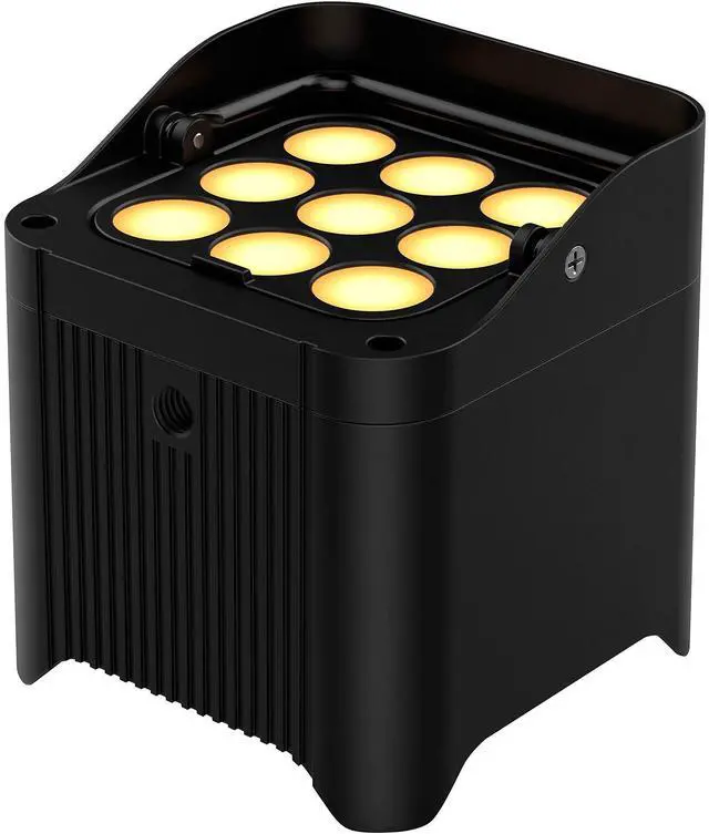 Lighting designers and event coordinators in search of a wireless, battery-operated PAR should look no further than the Chauvet DJ Freedom Par Q9, a bright, powerful, and 100% wireless fixture well suited for special events, weddings, performance halls, and more. The fixtures nine quad colored LEDs (red, green, blue, amber) are rated for 50, 000 hours and will provide years of reliable service. An adjustable kickstand enables you to shine light directly where it is needed, while the built-in glare shield prevents light spillage. A magnetic diffuser attaches to widens the coverage area.