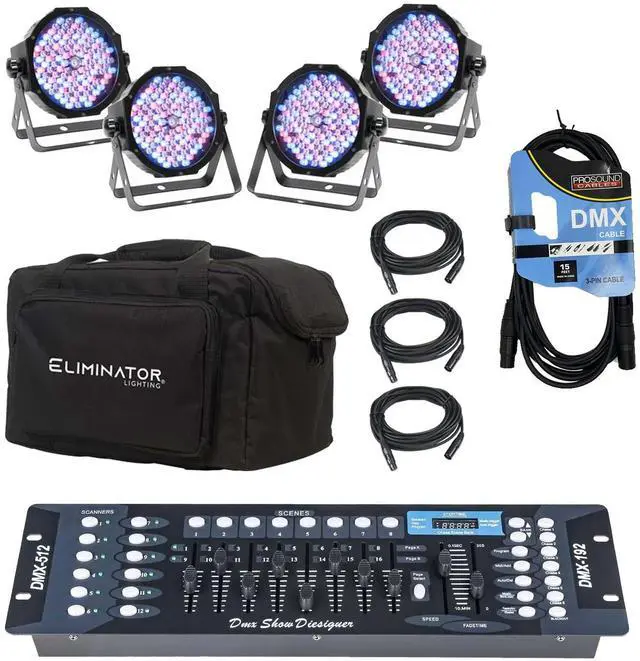 The American DJ Mega Flat Pak EP, a complete wash light setup that combines four Mega Par Profile Plus LED fixtures with three 6 DMX cables and a soft carrying bag to provide the primary components of a mobile lighting rig with protection from the rigors of on-the-road wear and tear. The Mega Par fixture is a compact, low-profile par designed for uplighting and stage lighting. This 2-in-1 fixture offers RGB color mixing plus UV black light, making it a multiuse wash fixture. And with 32 built-in light shows and 64 color macros, the Mega Par Profile Plus is an ideal solution for multiple venues.