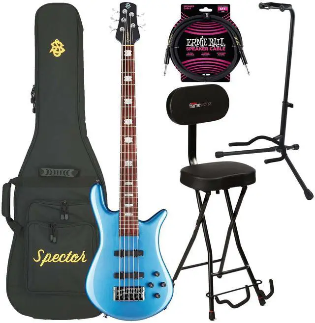 Spector Euro 5 Classic Bass Guitar, Metallic Blue Gloss, Gator GFW-GTR-SEAT and Stand, ErnieBall 1/4 Cable Bundle