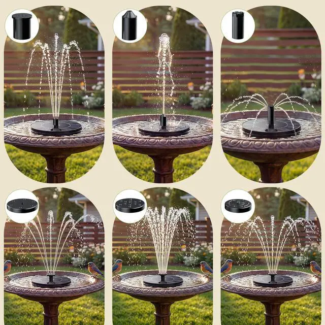 6 Adjustable Nozzles for Customizable Sprays Equipped with 6 different nozzles, this solar bird bath fountain allows you to easily switch between various spray patterns (height and shape) to match different scenes. Customize your garden atmosphere freelywhether for a quiet backyard or a lively patio, it brings endless fun to your outdoor decor.