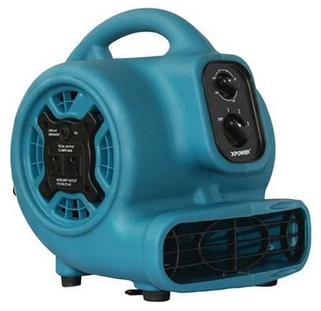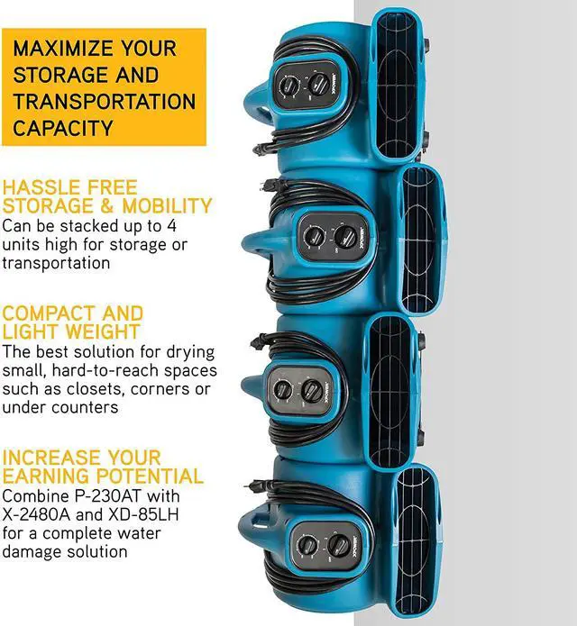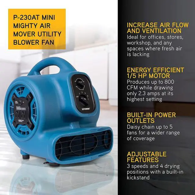 XPOWER P-230AT P-230AT 1/5 HP 800 CFM 3-Speed Mini Air Mover/Floor Dryer/Utility Blower Fan with Timer and Power Outlets&bullWide pattern of airflow--ideal for cooling garage and home or drying carpets, leaks and spills&bullCompact size fits in tight spaces to direct airflow inside auto interiors, under counters and more&bullLightweight, compact and durable polypropylene plastic housing design&bull3 speeds with 4-angle drying positions (0deg, 20deg kickstand, 45deg and 90deg )&bullAlways-on setting or 3-hour set-n-forget timer options&bullBuilt-in power outlets for daisy chain with dual thermal protection&bullPowerful and energy-efficient 1/5 HP induction motor&bullLow 2.3 amp draw with 800 CFM airflow capacity&bullConvenient grab-n-go handle handle and wraparound power cord design&bullStackable up to 4 units high for easy storage and transportation&bullETL/CETL safety certified and meets OSHA safety requirementsP-230AT 1/5 HP 800 CFM 3-Speed Mini Air Mover/Floor Dryer/Utility Blower Fan with Timer and Power Outlets