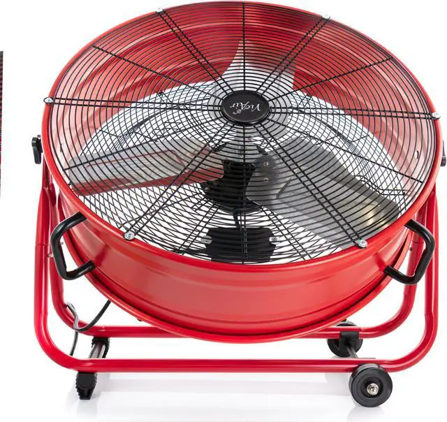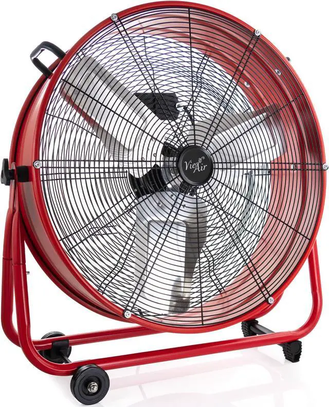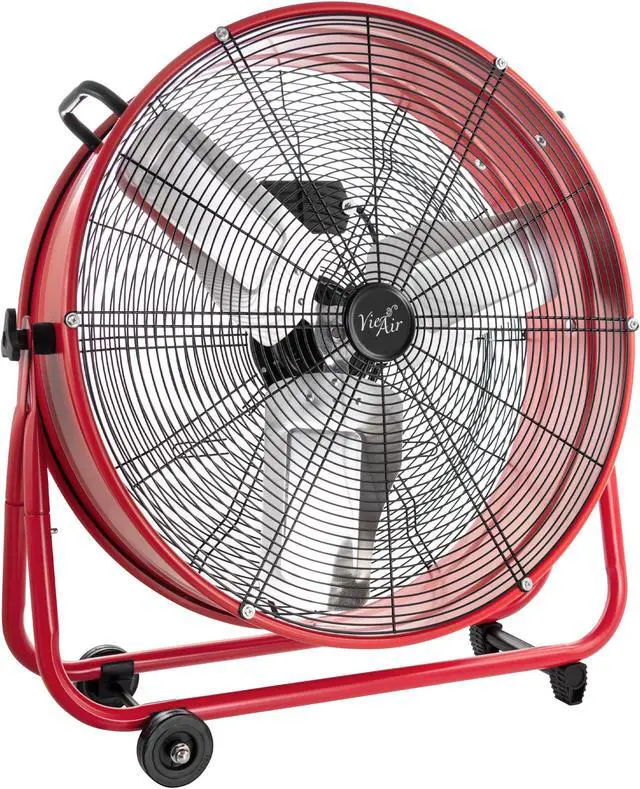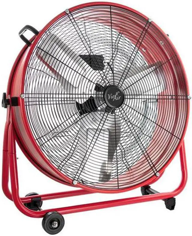 The Vie Air 24" Floor Drum Fan gives you the industrial style ventilation with a Ball-Bearing motor that provides high quality airflow with 3 speeds of Low, Medium and High. Sturdy metal housing for enhanced rigidity. Comes in a beautiful bright red color, is equipped with two grip handles on top and wheel support for ease of portability. Fan head tilts to any desired direction for direct airflow vertically and tightens in place with a screw knob. This is perfect for any of your large air ventilation needs, whether it is for home or commercial indoor/outdoor use.