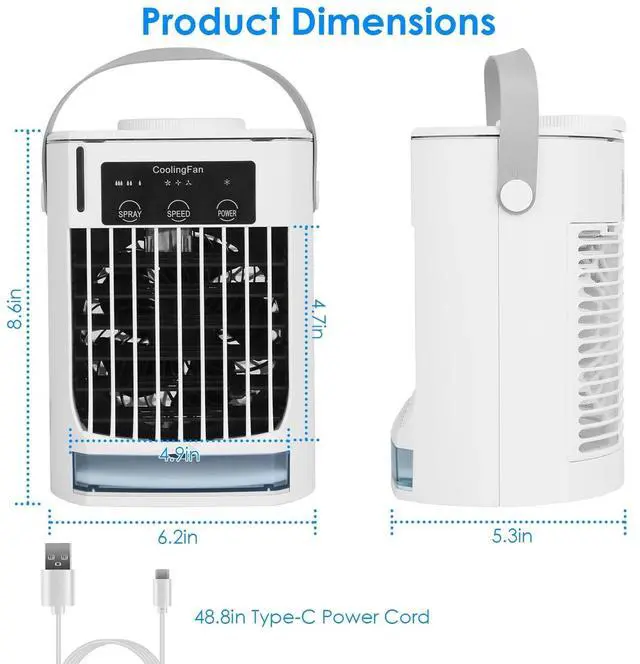 Plug & Play:Without battery charging limitation,save you from boring waiting time,just plug in Type-C power cord and then our air conditioner fan can bring you endless fresh air and coolness. Less than 55dB noise,will not disturb your working,sleeping,playing,etc..